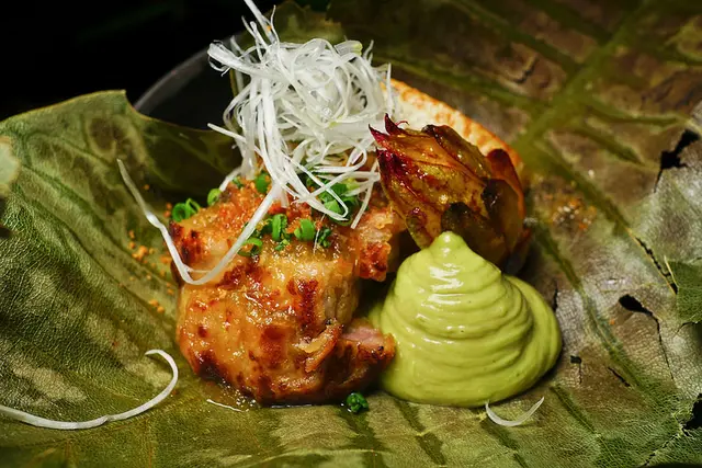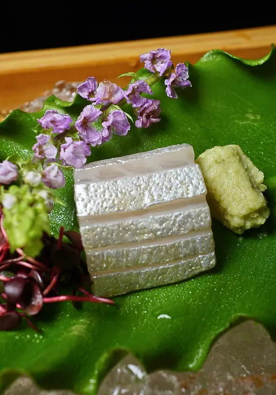 綠色部份是無花果醬, 肉的部份是黑鮪背部油多一點的地方, 搭配幽庵汁