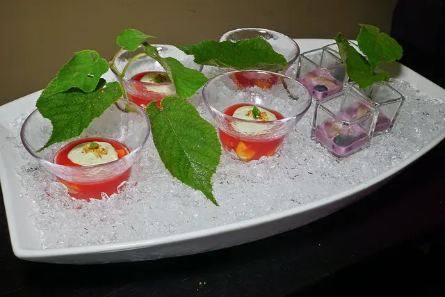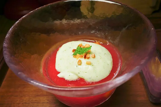 紅心芭樂打成泥, 以橄欖油, 米醋, 醬油調味, 然後搭配已燉煮入味的海帶芽, 大黃瓜, 帆立貝一起吃, 有點像雪酪 ( sorbet )