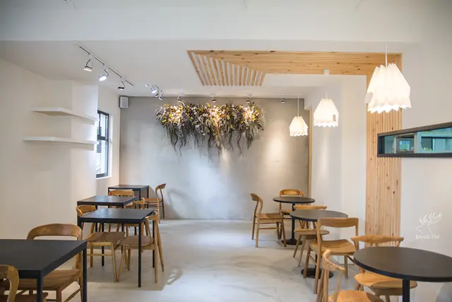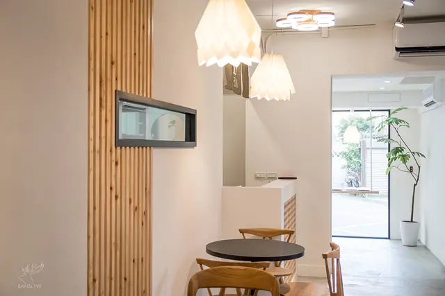 在桌位區旁可看到飲料與甜點準備的工作區,上方掛著日式布簾,一旁白色的牆面結合木質裝飾,細節中都透著些日式風味。