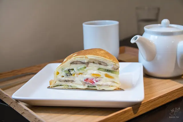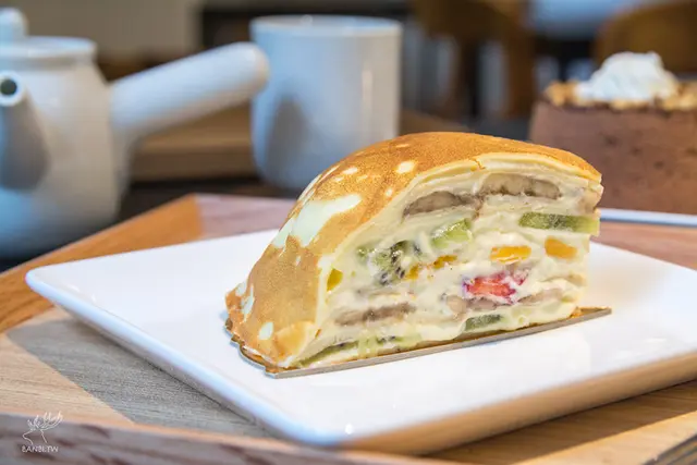 千層蛋糕餅皮雖不是極薄型,但口感軟綿柔嫩,帶有淡淡的蛋香,夾雜了香蕉、奇異果、草莓等水果外,還有香甜滑順的香草卡士達醬,風味不膩又很順口,挺不錯的!