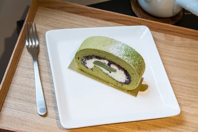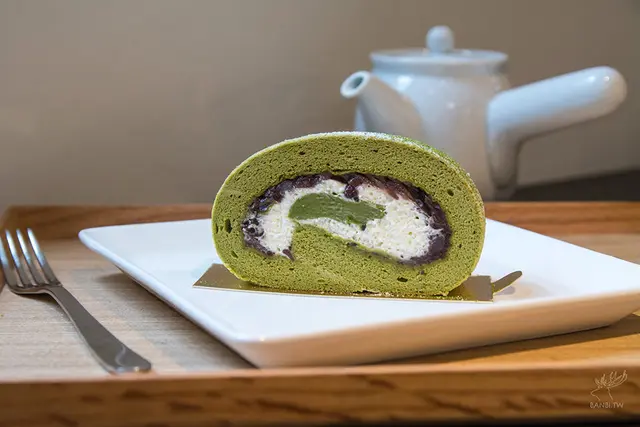 蛋糕捲口感Q軟,內有包覆清爽的鮮奶油與抹茶醬、紅豆,抹茶風味不重,是淡淡的抹茶香氣。