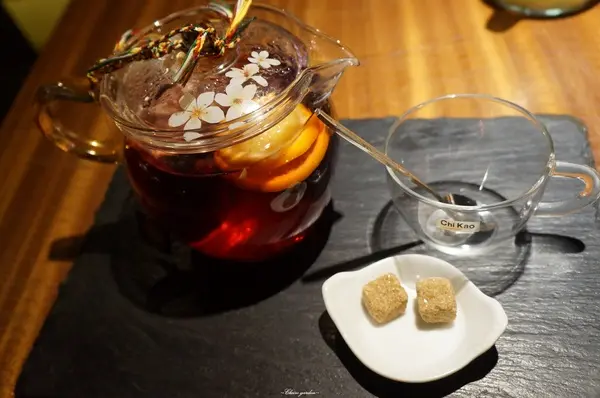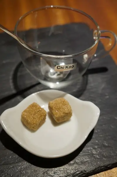 用小石板裝著茶具搭配透明的茶杯組感覺蠻有質感的店家附的還是黑糖呢