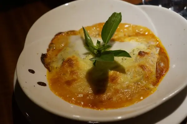 因為焗烤需要等待20分鐘端上來的千層麵有點傻眼呢怎麼跟圖片有落差吃起來一點都不千層的而且焗烤得太稀了除了番茄味外吃不出到底有啥料在裡面挺讓人失望的一道料理 香甜蘋果布蕾金磚吐司