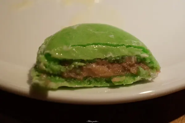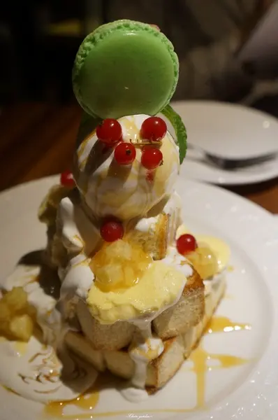看起來好華麗啊鮮奶油像瀑布一樣由上而下留下旁邊還裝飾了蘋果粒跟櫻桃吐司吃起來酥酥脆脆的鮮奶油加布蕾的搭配讓吐司吃起來更有風味馬卡龍裡面是莓果的餡料也挺不錯吃的