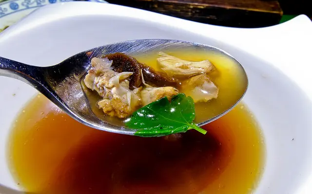 法式清湯, 材料卻是超台的老菜脯與雞肉, 微鹹的湯品, 老菜脯夠黑, 不過菜名得看仔細, 如果因為雞湯二字把它想成中式雞湯