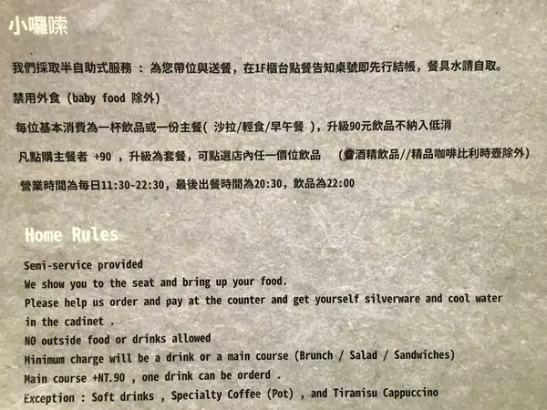 消費方式:低消一杯飲料或主餐 / 無用餐時間限制 / 不加收服務費 / 可定位 / 可包場