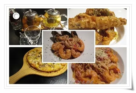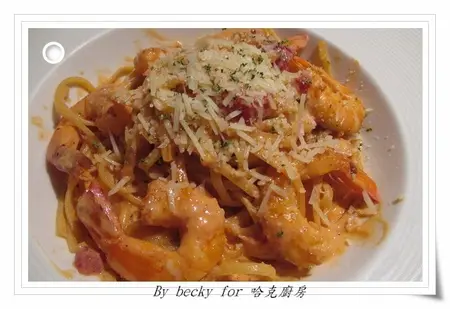這道主食裡頭有蕃茄、洋蔥、起司及鮮蝦等,店家真的很貼心,方便客人吃食,所以每一隻蝦子都去殼且很大一隻,麵條是細扁麵,與蒜頭及奶油的混合,吃起來軟硬適中,裡頭蒜味很重還帶些微辣且還有黑胡椒的味道,不過卻不會很膩,很好吃,很推薦這道主食。