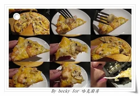 這個薄餅裡頭有蝦子、蘑菇、洋蔥、蒜頭及二種起司;蝦子很完整很大隻,味道很鮮甜,搭配上洋蔥的甜及二種略甜鹹的起司,咬一口還會牽絲,裡頭加入蒜頭,所以還有些微嗆的味道。