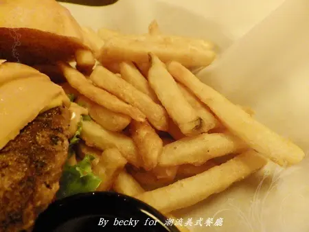 薯條部份,炸的很脆酥,旁邊的沾醬有點像是美乃滋醬,沾著吃有些微甜酸,感覺上應該是店家自製的,而薯條本身帶有點鹹味,單吃就很不錯。
