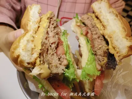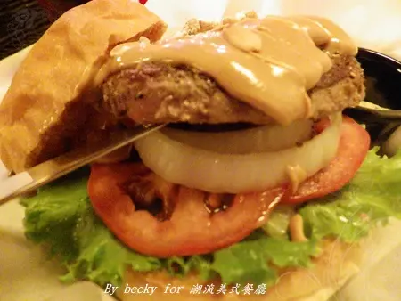 最上面有著花生顆粒、厚厚的花生醬、牛肉、洋蔥、蕃茄及生菜,從中切一半,可以看到層層分明