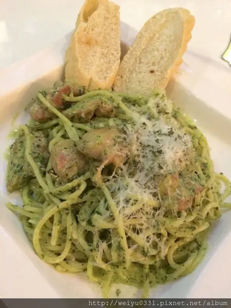 一上菜就能聞到濃濃的迷迭香,比較偏硬的口感麵條剛好也是我愛的,青醬的香濃讓你更開胃,更貼心的是最後附上兩塊麵包,讓你把最後的青醬都能夠一口氣吃光光(覺得節省)。