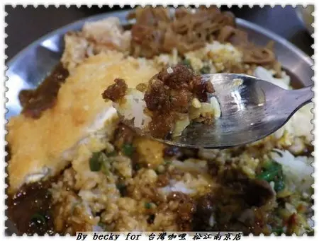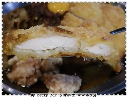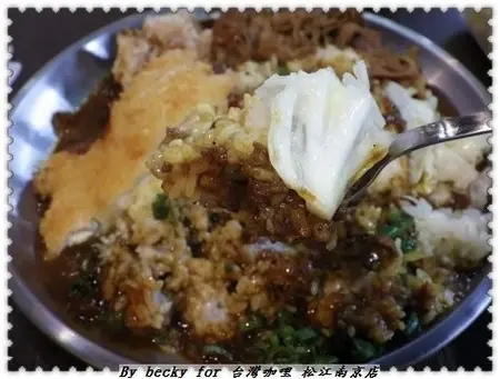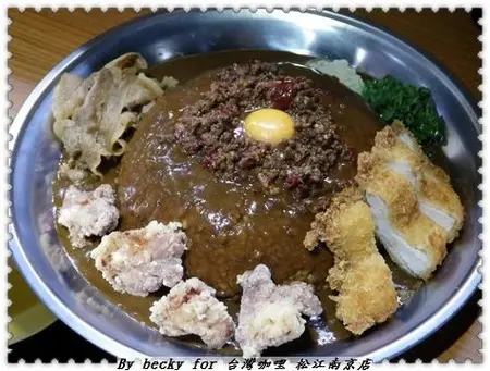 綜合台灣咖哩飯~這是店長推薦的,通常不知道如何點餐的,店長都會推薦這道,沒錯~這可以享用到三種主食-涮豬肉、炸雞、炸豬排,在中間有著滿滿的肉燥的咖哩飯,還有一顆生雞蛋,整個讓人很驚嘆。