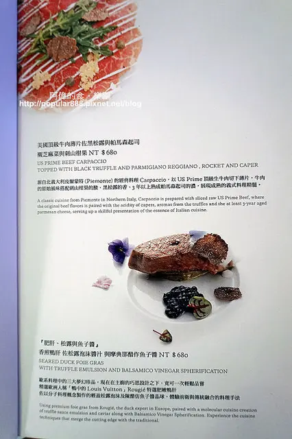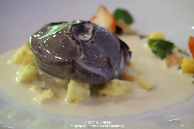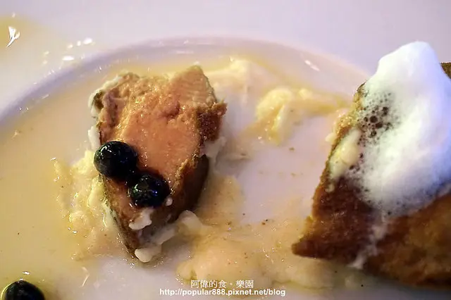 松露以分子料理的方式製作成了松露泡沫,義大利摩典那陳醋作成了有如魚子醬般的晶球,光是這兩招配料的呈現就讓人開了眼界,而肥厚的鴨肝又煎得那麼令人垂涎。