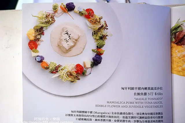 擺盤呈現有如一個蔬菜花圈,中心以鮪魚醬覆蓋匈牙利國寶綿羊豬肉。什麼是綿羊豬呢?