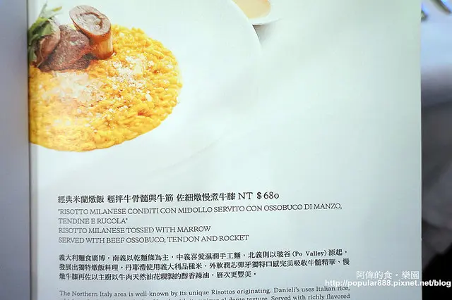 使用義大利進口米燉煮的米蘭燉飯,加入番紅花與帕馬森起司在其中,並吸收了牛髓精華,鮮美滋味不需贅述。但習慣重口味的人會覺得鹹度偏淡,可滴幾滴辣油增加香氣與提味。