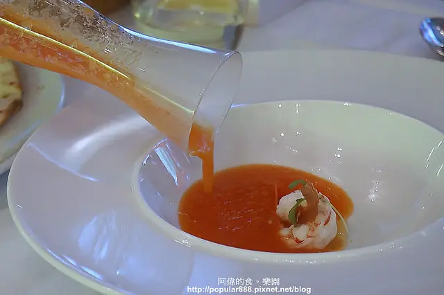由服務生在面前將番茄濃湯倒入盤中,帶著溫熱清甜,酸度不高,還嘗得到番茄泥。而甜蝦與頂端的一小塊起司,則相對提出鹹鮮。