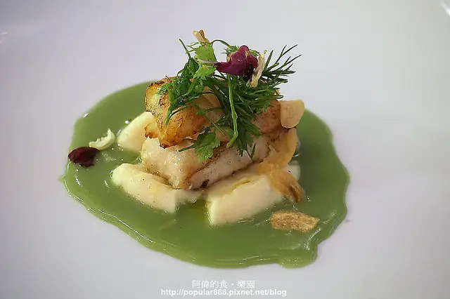 ◎龍膽石斑佐蛤蠣細香蔥醬汁襯薄蒜片