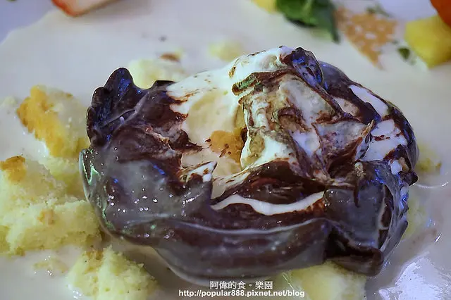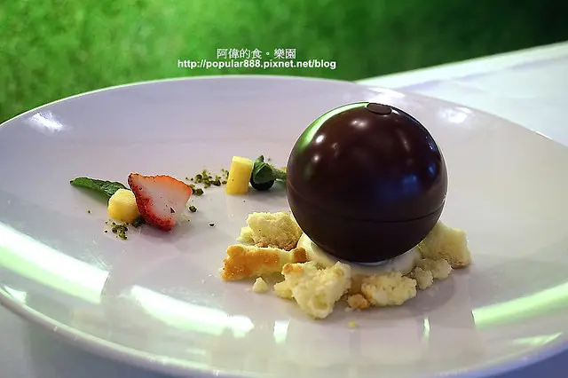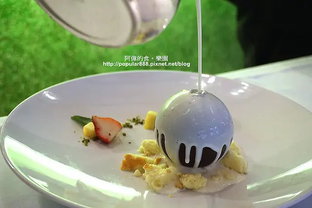吃義大利餐怎麼能少得了"提拉米蘇"做結尾呢?但不同於一般餐廳的提拉米蘇,這裡的主廚創意與想像力發揮到極致,絕對讓你"驚奇"!首先呈上的是一個巧克力球在盤上,底部用卡士達奶油固定。
