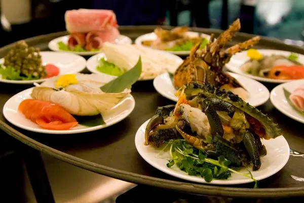 紅蟳、扇貝、龍蝦、豬肉片、牛肉片、明蝦、象拔蚌、魚皮、金針菇、鴻喜菇、冬粉,