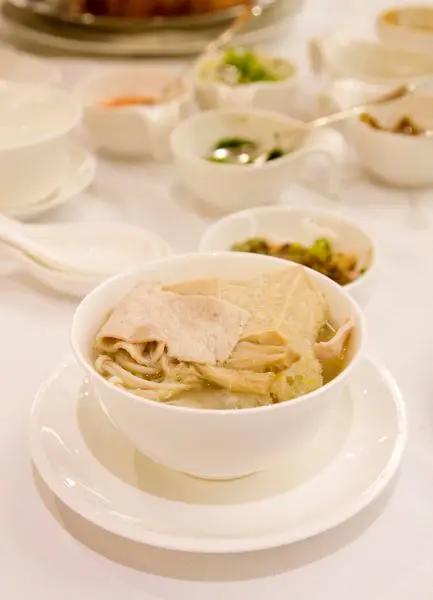 在第一輪下料前服務生會先盛一碗清湯請客人品嘗,