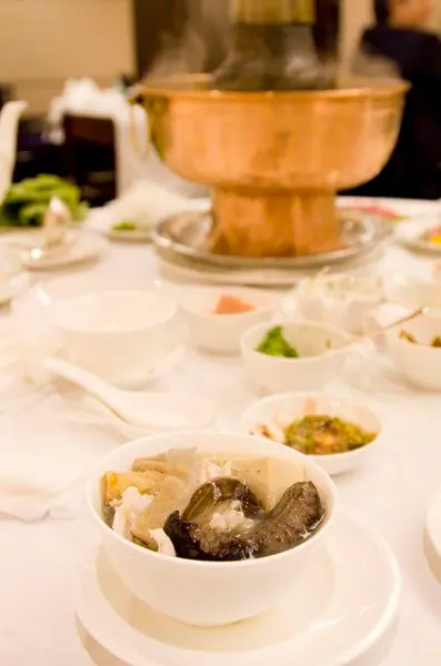 火鍋以菊花入菜,搭配當季食材熬煮烹調,各式火鍋料及沾醬則以小碟裝盛,和火鍋一同上桌,