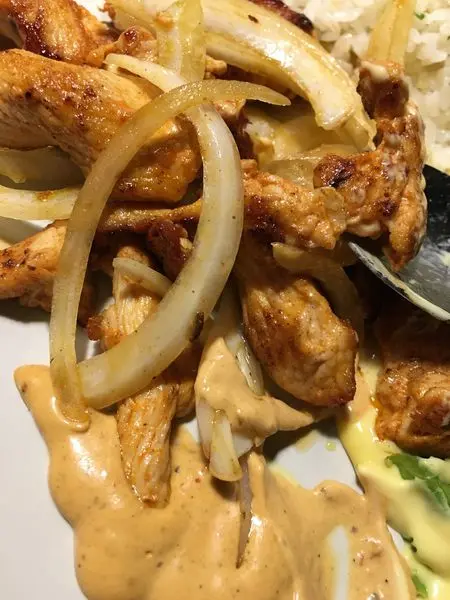 主菜就是烤雞肉拌洋蔥片,還有特製的煙燻辣椒醬,非常開胃,搭上新鮮的沙拉平衡的相當好,店員說是招牌菜,我覺得蠻值得推薦的,這盤180,分量搭配得很好。