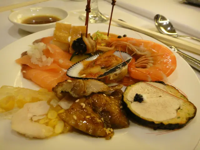 由上方開始順時針依序為煙燻鮭魚、鯊魚烟、歐式小點、鮮蝦、海貝、魚卵、蒲燒鰻魚、玉米雞肉凍。
