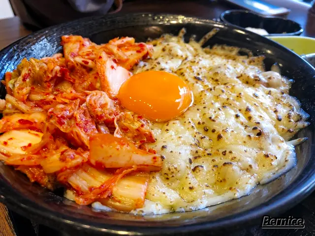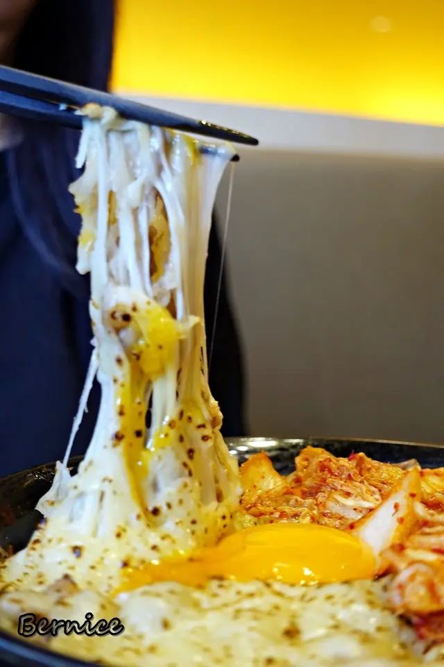 牛肉上頭放上切達和模扎瑞拉2種起士,一旁在擺上脆口的韓式泡菜,最後再加上一顆生蛋黃