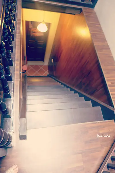 往下望去真的相當陡,垂吊的燈飾、紅色的地磚、木製的樓梯很有另一種老滋味。