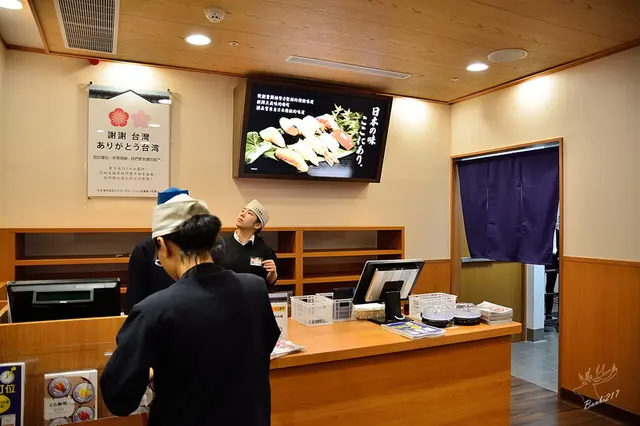 くら寿司(藏壽司 Kura Sushi)台北第一間店(松江南京店)位於地下室一樓,店內有非常多用餐座席,一抵達店內便有服務員熱情講解迴轉壽司盤拿取方式,之後便交由桌號與路線圖讓客人入坐。