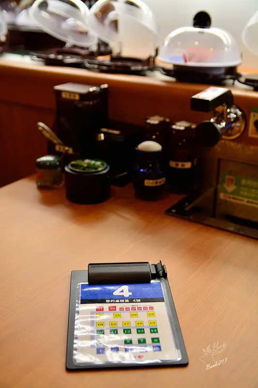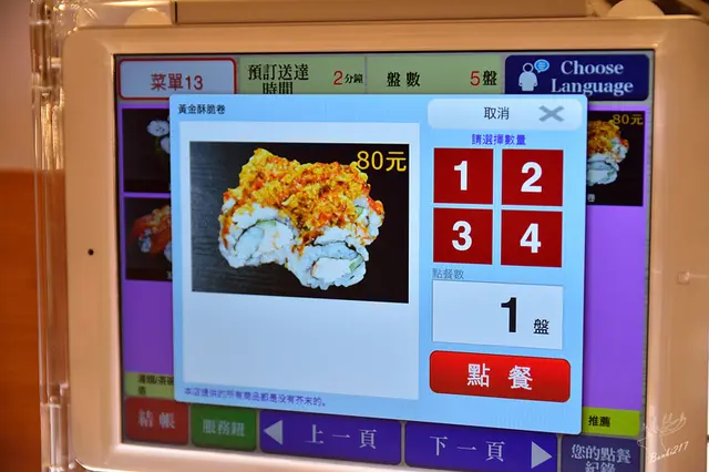 使用平板點選豆皮烏龍麵,同樣也由輸送帶送餐,須按下紅色位置打開。