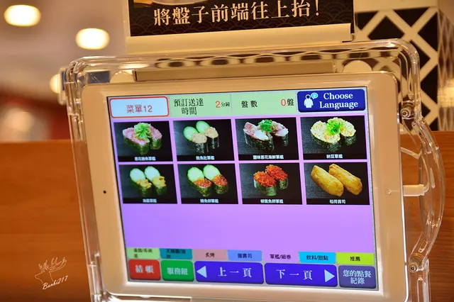 くら寿司(藏壽司 Kura Sushi)平板觸控螢幕,會有菜單、客人使用平板的點餐紀錄、已放入回收區內的盤數、使用平板點餐的預定送達時間、服務鈕、結帳鈕(按下結帳鈕後將盤子放入回收區,會由店員前來確認40元餐點盤數與其他品項價格,最後再拿著桌號至櫃檯結帳即可。另外,現在用餐後拍下餐點照片上傳並打卡,且有至くら寿司(藏壽司 Kura Sushi)松江南京店粉絲團按讚,結帳出示供店員確認便可有9折優惠)