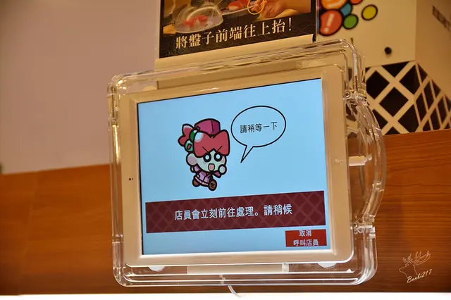 若有需要找店員時,按下服務鈕所顯示的畫面。店員前往並處理完畢後,在按下"取消呼叫店員"按鈕即可回復到正常選單。