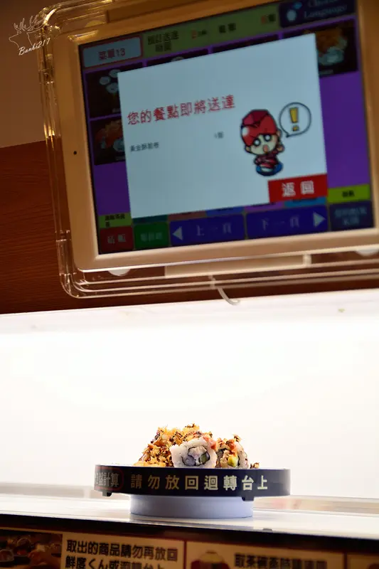 點選好後,除了在平板上方顯示餐點抵達的時間。在餐點即將抵達前,螢幕上也會出現提醒,接著餐點便會出現在上方的迴轉台上。