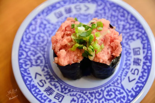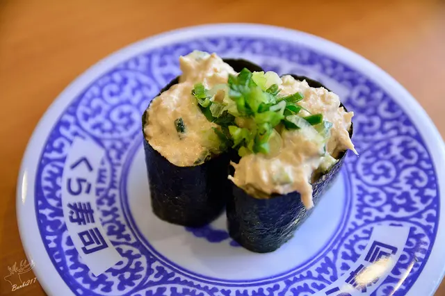 使用平板點餐選擇了生的蔥花鮪魚軍艦握壽司,從輸送帶送上來的時後,我想這怎麼看都像是早餐店常見的鮪魚沙拉,難道說くら寿司(藏壽司 Kura Sushi)蔥花鮪魚軍艦長的不一樣?吃下去後,真的是鮪魚沙拉啊啊啊啊啊啊啊!!!!