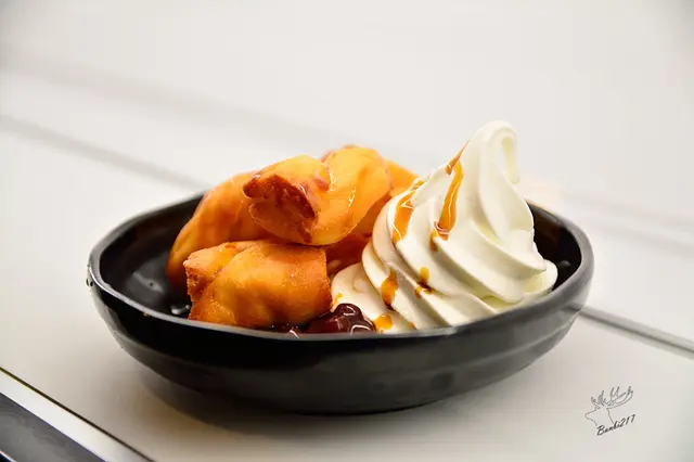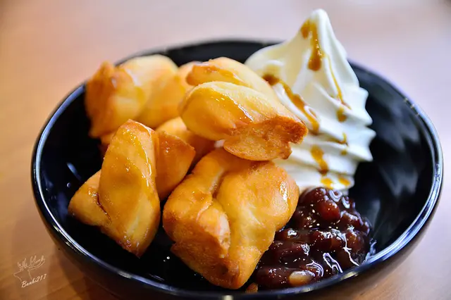 炸好的豆乳甜甜圈很酥脆,與牛奶霜淇淋、紅豆泥,吃起來是又熱又冰涼的口感,很不錯呢!