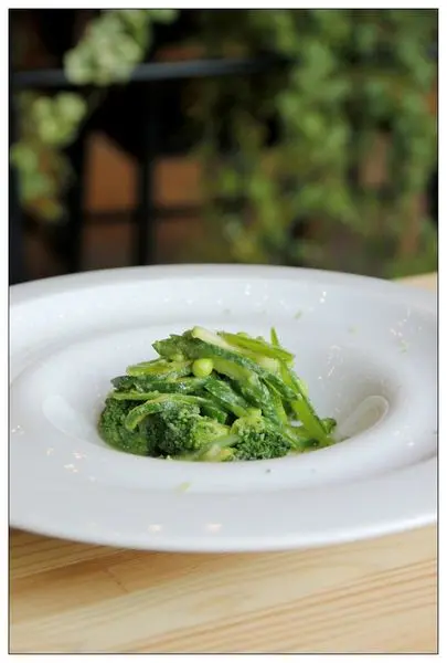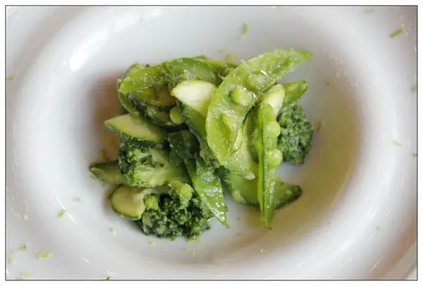 季節蔬菜裡包括了碗豆、黃瓜以及花椰菜~~淋上了純手工製作的蘆筍醬汁