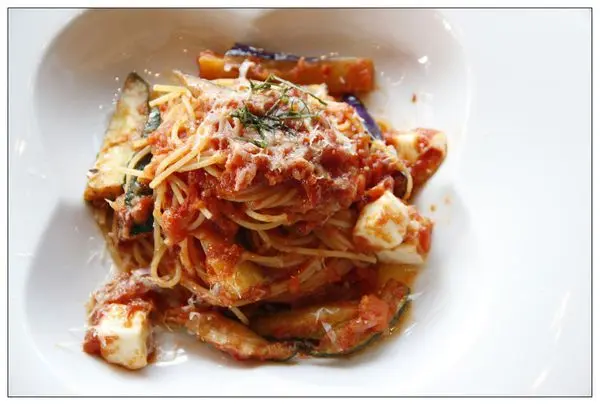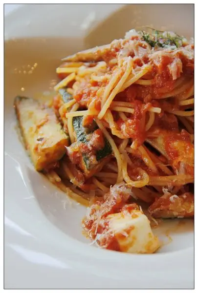 煮到軟硬適中的義大利麵吸附著酸甜的番茄醬底搭配濃郁的起司塊和蒜醬~~口感豐富又美味