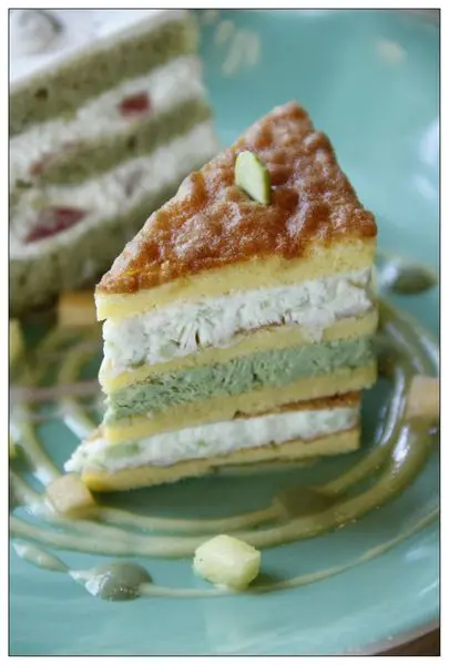 中間不同的鮮奶油夾層以及抹茶鮮奶油還混合了毛豆碎粒~頗富口感!