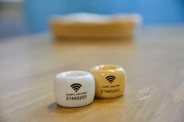 九州鬆餅設有WIFI,這WIFI帳密的顯示器具很可愛。