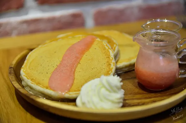 詢問店內人員得知店內搭配其他口味的鬆餅基底為九州七穀原味鬆餅,因已打算點莓果鬆餅,故我們點牛奶鬆餅品項,吃起來口感帶點Q度,穀味滿濃厚,我與朋友都覺得這較適合與鹹的搭配。今日果泥可從奇異果與草莓中二選一,我們選擇草莓,吃的出是新鮮草莓製成,有自然草莓香氣,不過較為稀一點。蜂蜜加了白酒的關係所以較為稀釋,略帶點酸味與酒味,像是酒釀的味道,一旁的鮮奶油滿清爽的。