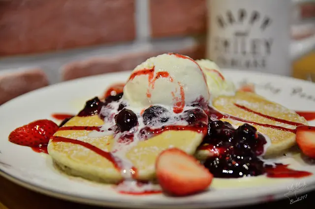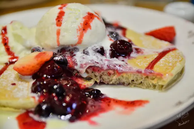 以九州七穀原味鬆餅為基底,搭配草莓、綜合莓果、莓果醬、鮮奶油、冰淇淋、卡士達醬,我與朋友都覺得牛奶的穀物味較重。一旁的綜合莓果醬酸甜,還有許多莓果粒,而冰淇淋則中規中矩,鮮奶油清爽。