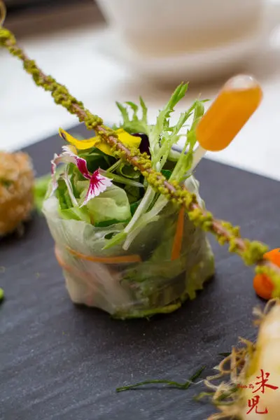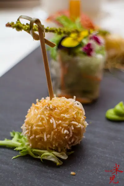 玉山龍蝦會香蟹,龍蝦只要活跳新鮮就好吃,高師傅用簡單的手法呈現龍蝦彈Q鮮甜的肉質,搭配炸薑絲,別有一番風味。而球狀的菜色則是把菲律賓大沙公的肉取出之後,做成蟹肉球炸成,金黃酥脆的外皮咬下去滿口鮮香,中間則是用越南米皮包的生菜卷,用來清新口腔用,這是一道把蝦蟹美味盡冶一盤的前菜。