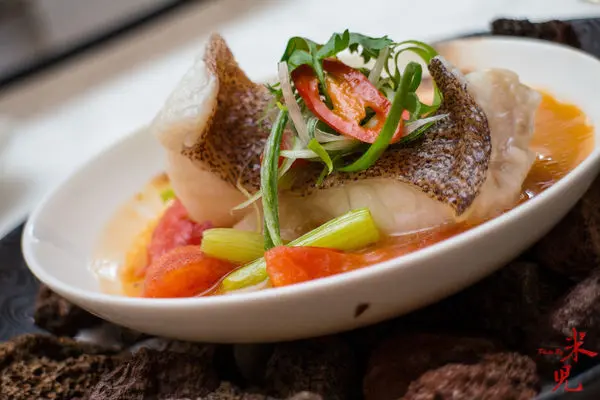 很有意思的「醋椒東星斑」,上桌時,底下的火山石因為淋了花雕酒,所以是熊熊燃燒著上桌的,製造不少視覺效果,當然,那撲鼻的酒香也為整體增添了不少分數。最妙的是裡頭那盤魚啦!底下的湯是用星斑魚骨加上老母雞熬的高湯,再與牛番茄、香菜梗、大紅浙醋及香料熬成酸香甘美的湯汁,上桌前因為淋上新鮮檸檬汁,所以更增加了清新的酸味,而其中淡淡辣味來自少少的TOBASCO,讓東星斑彈Q的肉質更加迷人,會忍不住吃個盤底朝天呢!