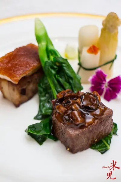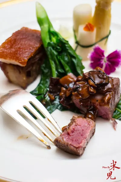 武當東西爭輝,結合西餐手法的主菜,是把用了陳年紹興及香料醃製的蒙娜麗豬,上面搭配一片傳統粵式烤乳豬,中間因為埋伏了一片鳯梨,把所有的味道融合在一起,特別令人驚歎,相較之下,淋上紅酒牛肝蕈醬汁的牛排,反而就相形失色,哈哈~難得可以吃到比牛排還好吃的豬料理呢!