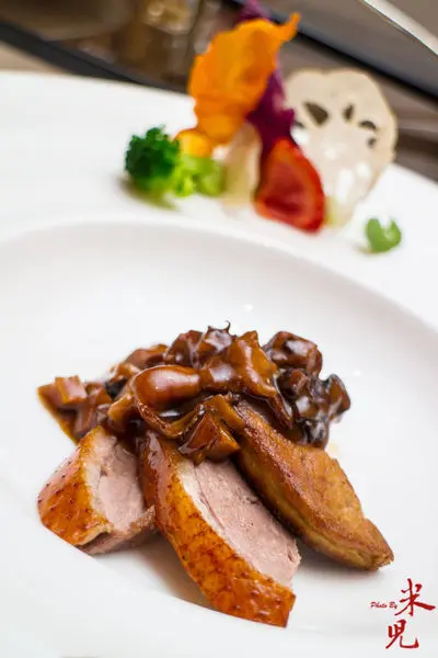 牛肝菌脆皮鴨襯鴨肝,以紅酒肉汁煮出來的菇蕈醬汁,淋在中式手法處理的脆皮鴨胸上,有一種東西融合的趣味,而煎得香酥的鴨肝則扮演了畫龍點睛的角色,讓整道菜更形精采。