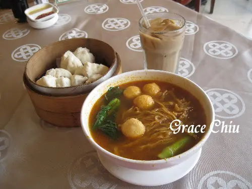 冰咖啡,朝食優惠時段點主餐加價10元,咖啡事先已做好調味,我覺得蠻好喝的,一碗咖哩魚旦麵.三顆小叉燒包.一杯冰咖啡,吃飽飽心情好,是個愜意的早晨~(這餐消費金額加一成服務費後總計132元)