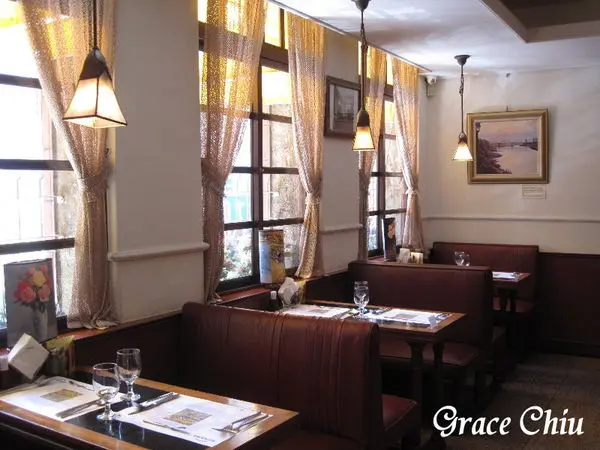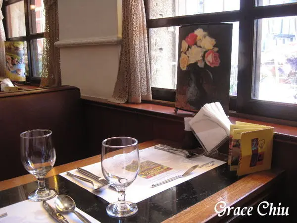 沿著窗格排列的六組四人座椅氣氛感覺特別好,雖然蠻想坐在窗邊,但約莫11點多抵達窗邊的座位邊幾乎都擺上了已訂位的資訊牌,服務人員引領我們坐在側邊靠牆的四人座.