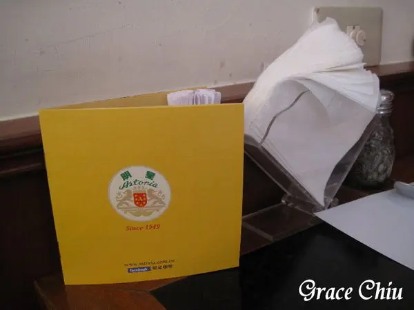 桌上除了調味罐與紙巾外還擺著一樓西點麵包的商品目錄,有興趣的可以翻翻看.