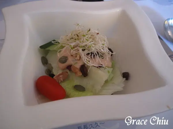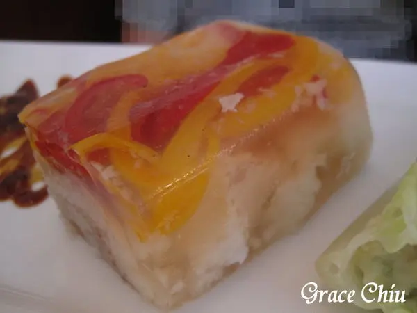 俄羅斯魚凍~這是一份冷盤餐點,有魚凍.生菜馬鈴薯沙拉,小缽裡裝的是生火腿片包著罐頭水果,菜單上寫著這魚凍是俄羅斯傳統家鄉口味,也是已故蔣方良女士的私房料理.